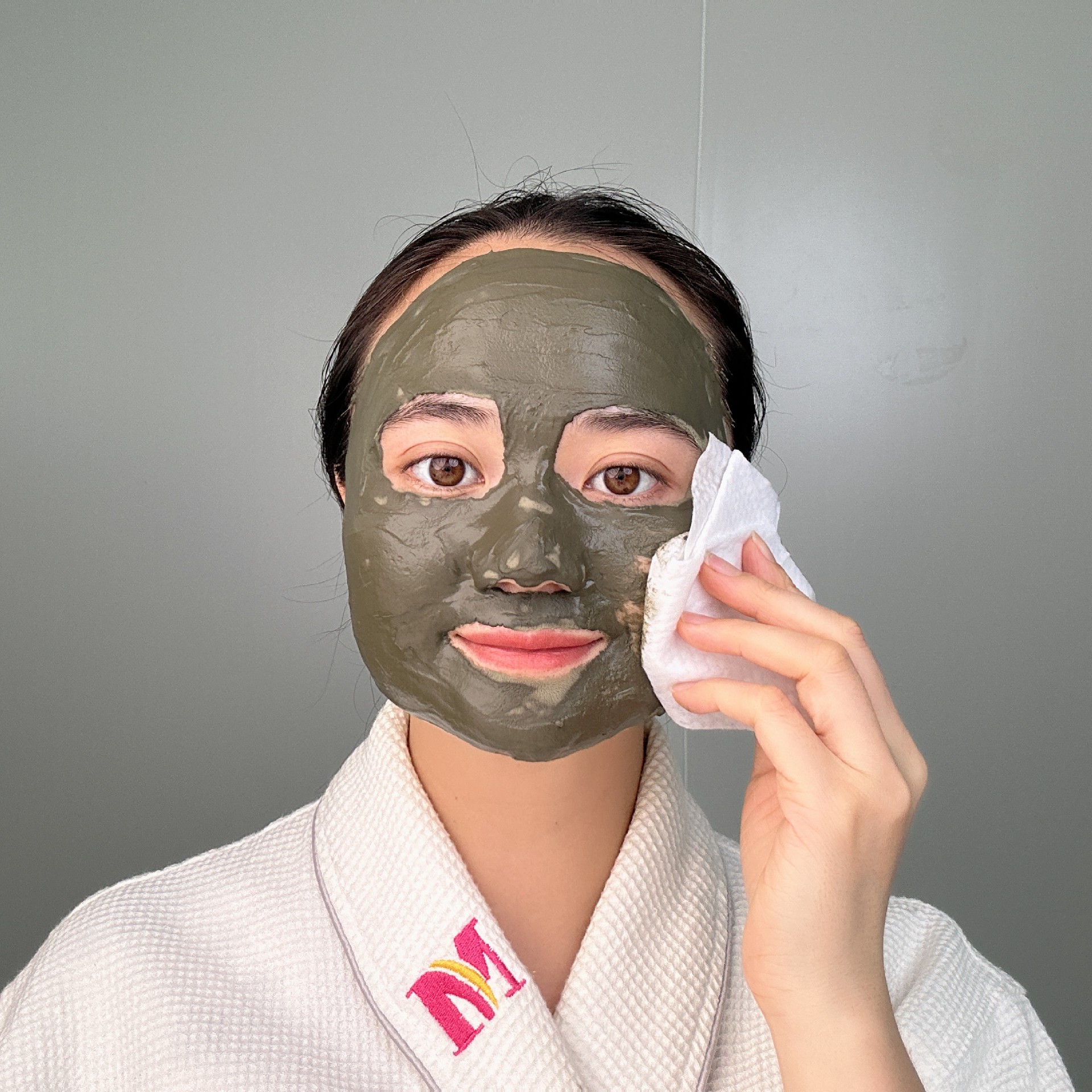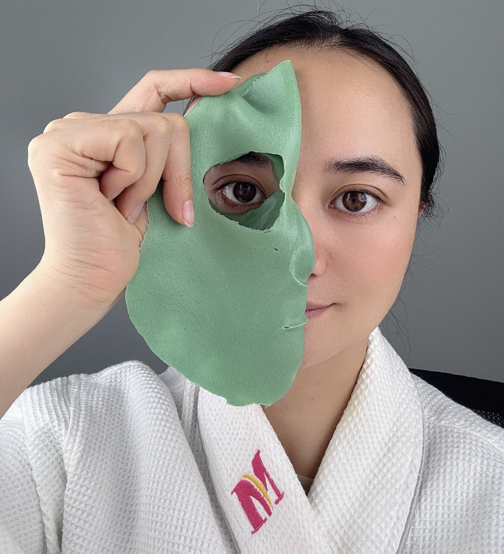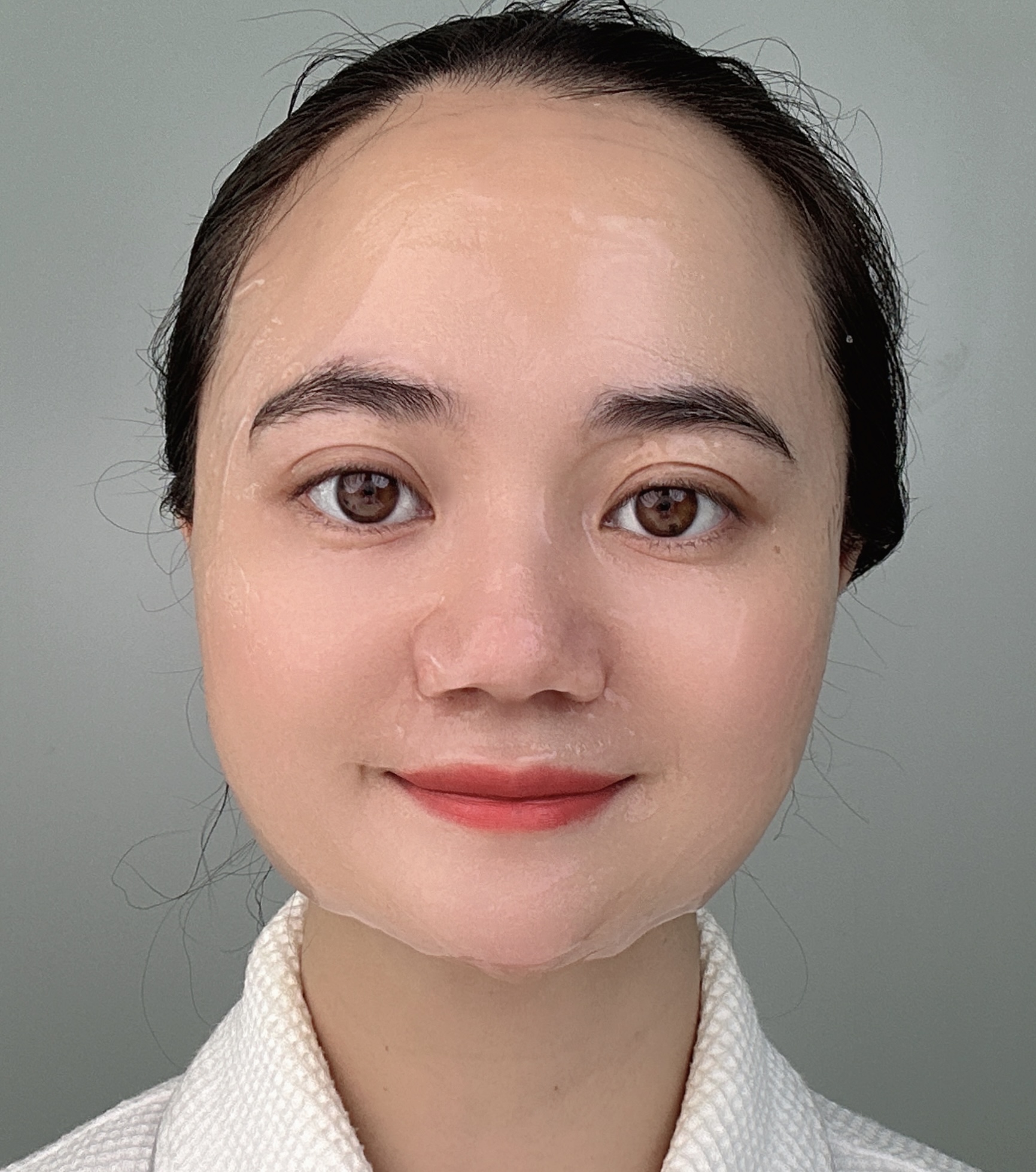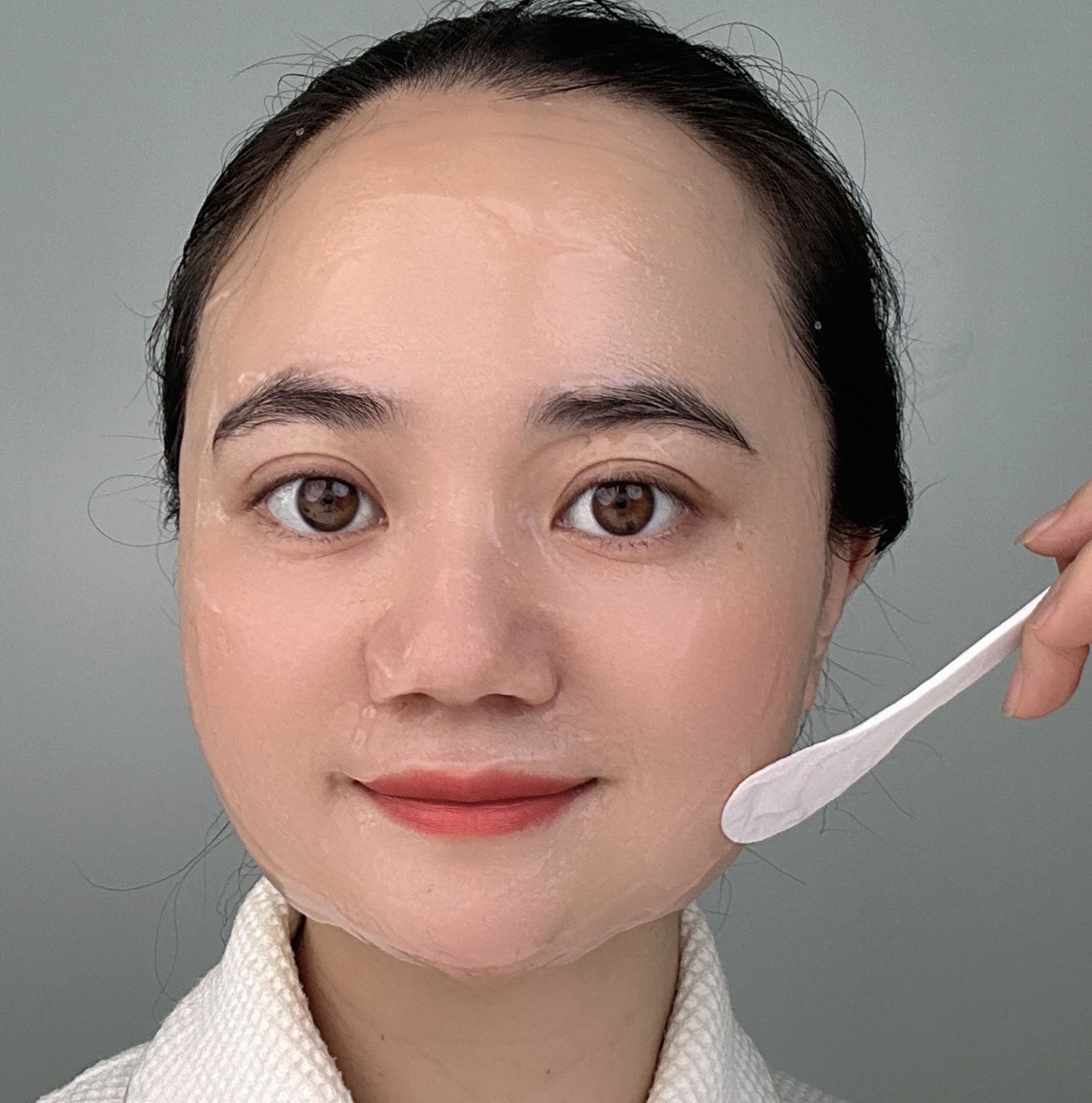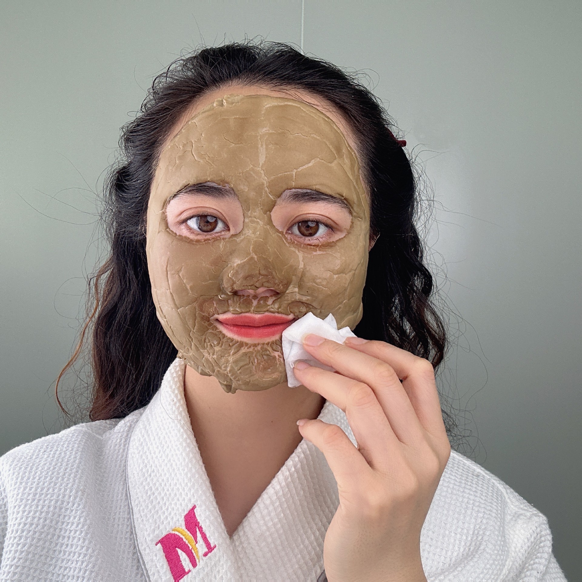 5、静待30-40分钟,用湿纸巾打湿面膜表面,特别边缘位置(防止干边红痒)
